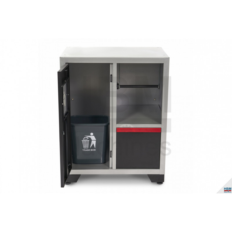Armoire de travail avec poubelle, tiroir et porte-rouleau.