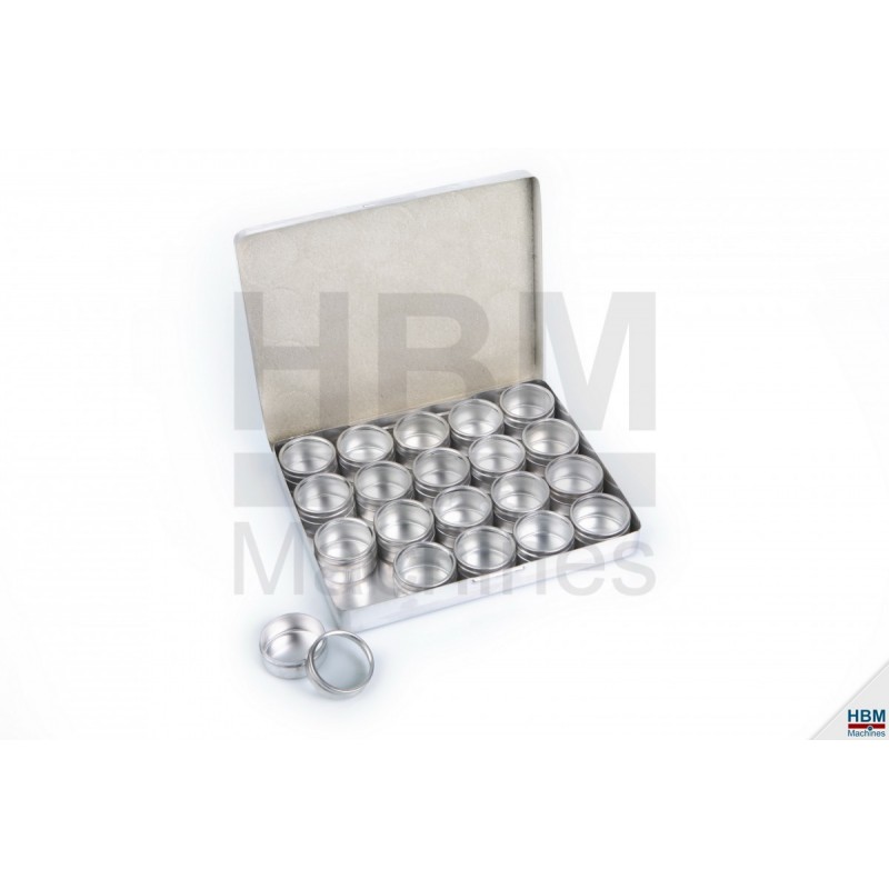 Boite en aluminium avec couvercle rabattable par charnière, dim. 180 x 114 x 25 mm (env.) et contenant 20 pots au couvercle vitré Ø 32 mm.
