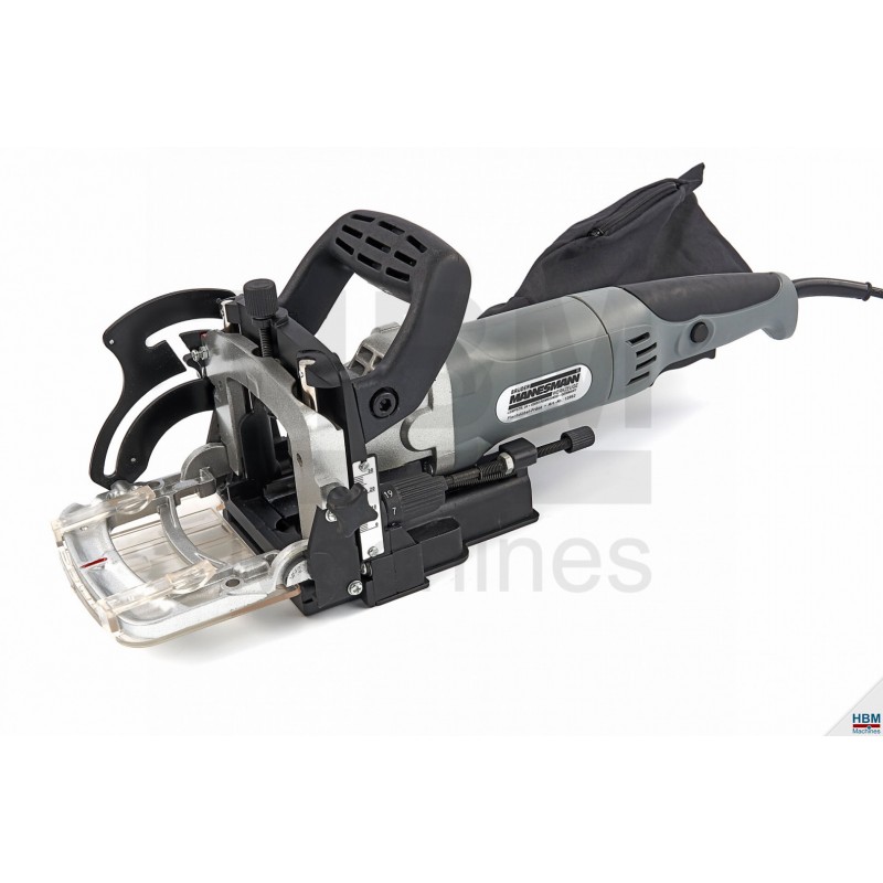 Appareil puissant pour le fraisage de rainures dans le bois massif, contreplaqué, panneaux de particules et de fibres. La fraise en bout pivote de 0 à 135° et réalise des rainures d'une profondeur maximale de 19 mm.