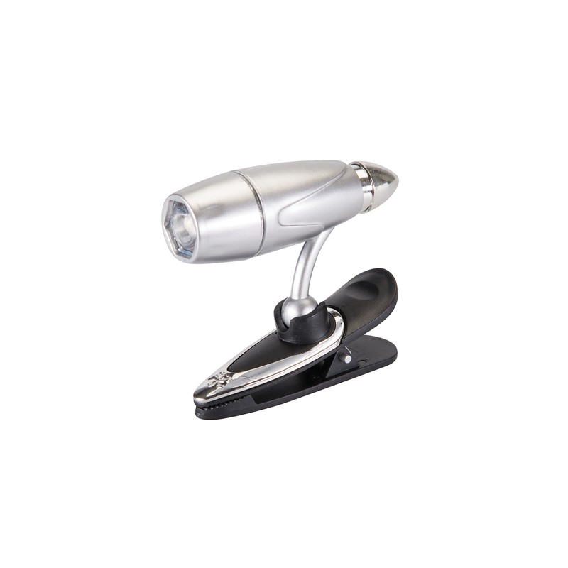 Lampe de lecture avec clip, tête orientable sur 360°grâce à son articulation à bille.
