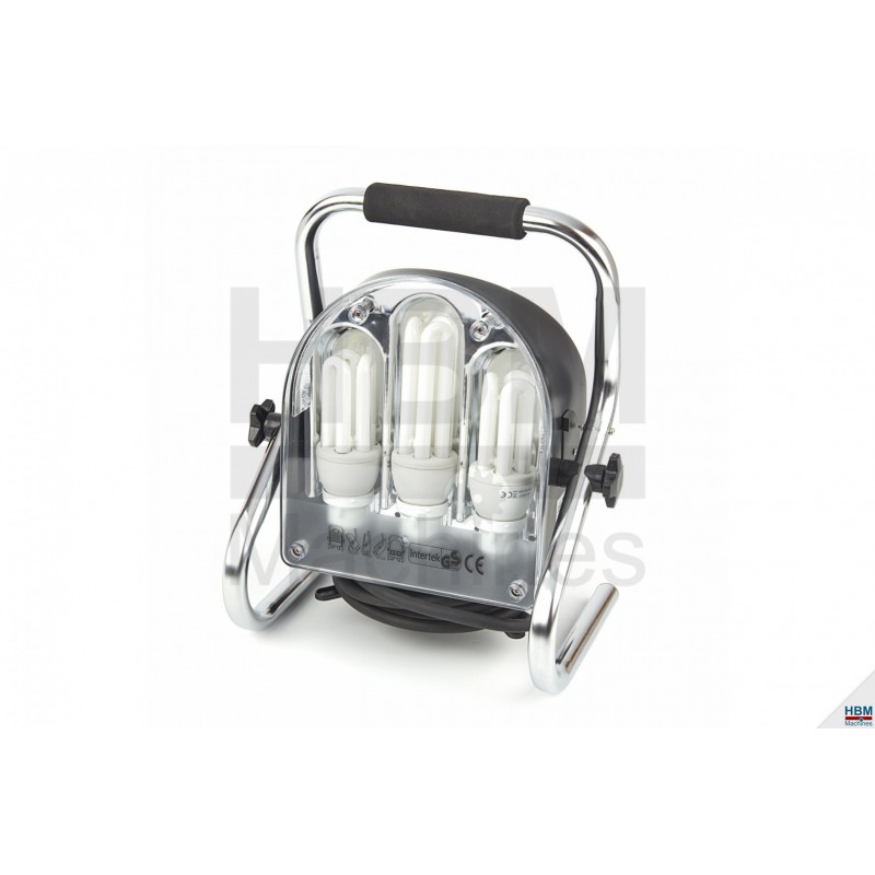 Lampe de travail économe en énergie, inclinable avec 3 lampes à économie d'énergie, commutable en 3 positions. 2 prises (230 V ~ - 16 A, anti-éclaboussures), câble de 2 mètres avec serre-câble et cadre métallique robuste avec poignée à prise souple.