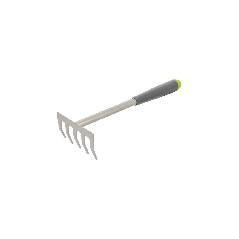 Râteau résistant à la corrosion avec tête en acier peint par poudrage. Poignée en plastique avec trou de suspension.
