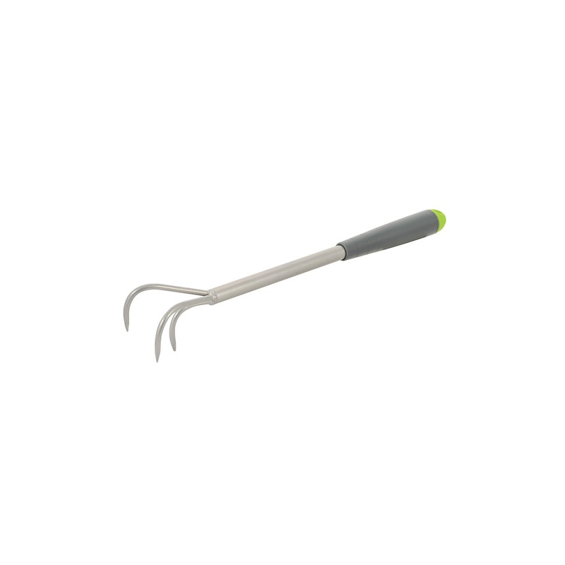 Griffe à 3 dents résistant à la corrosion, avec tête en acier peint par poudrage. Poignée en plastique avec trou de suspension.