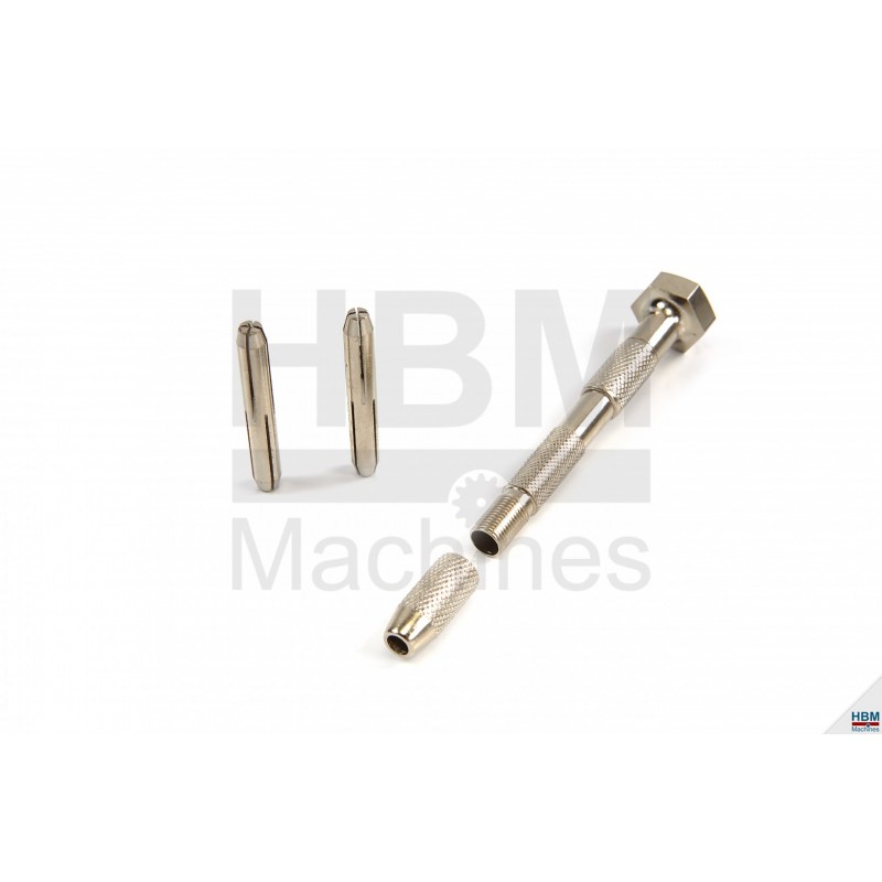 Porte-outil miniature en laiton nickelé avec poignée moletée et virole d'appui. 2 collets réversibles.