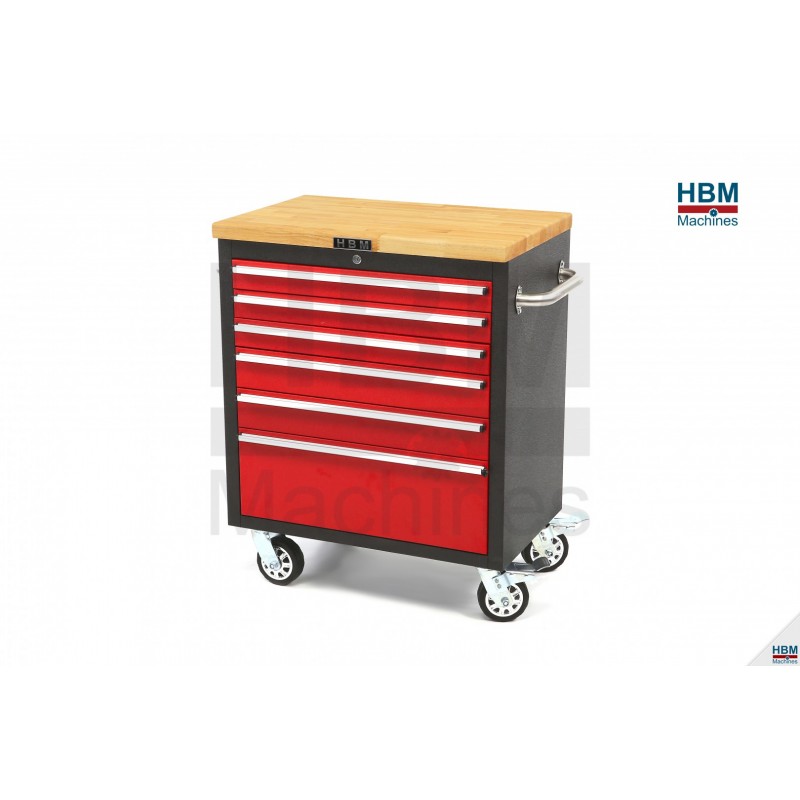 Servante d'atelier 6 tiroirs rouge, plateau bois - 5339